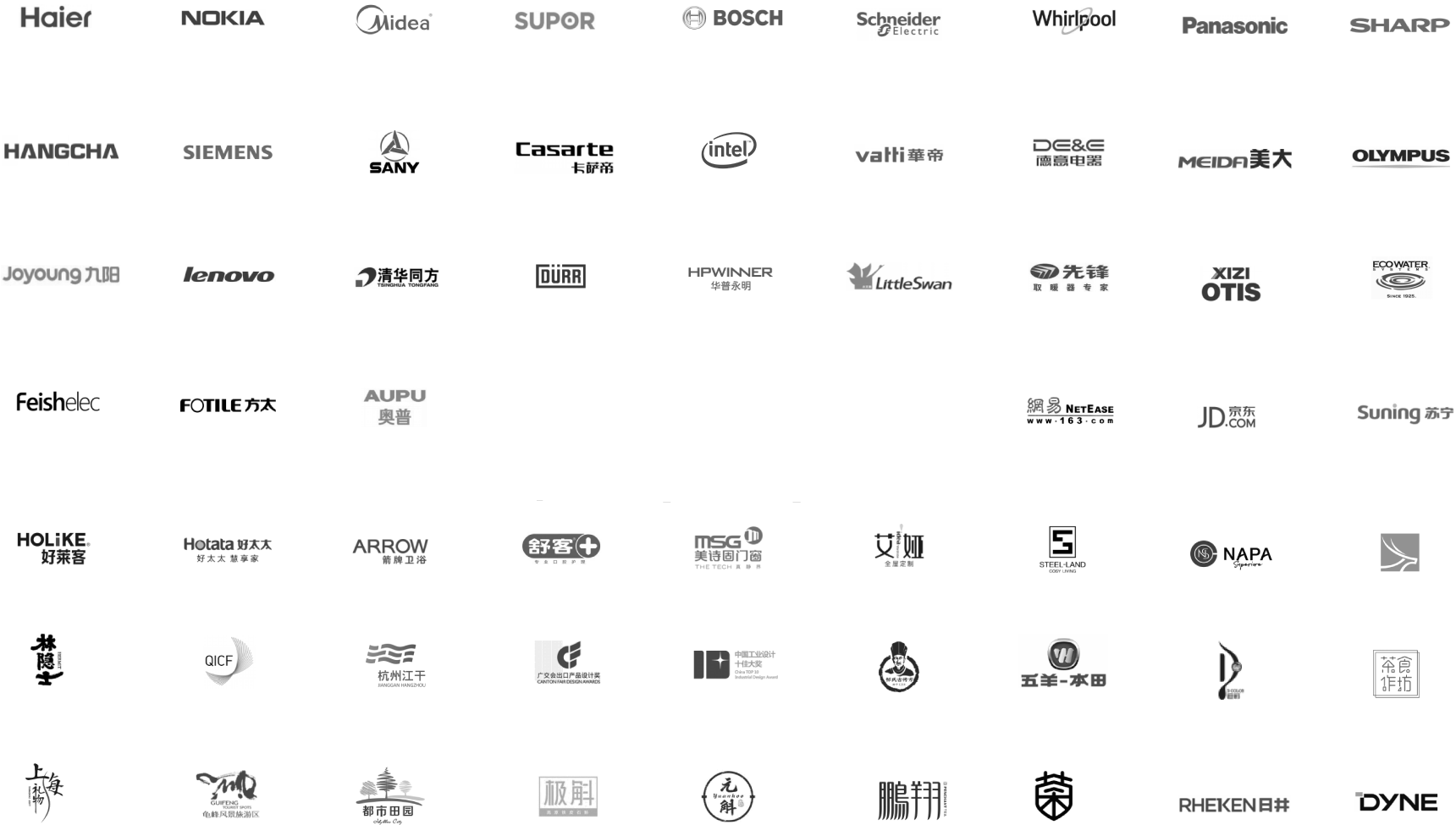 飞鱼整合设计服务企业包括GE、OLYMPUS、OTIS、BOSCH、施耐德、海尔、美的、格力、九阳、苏泊尔、安吉尔、林内、方太、德意、雀友等国内外领先品牌,设计领域覆盖家用电器、医疗健康、美容个护、母婴宠物、家居用品、工业设备、智能产品 、食品快消、文娱文创等领域。