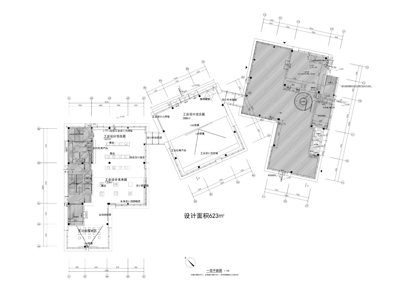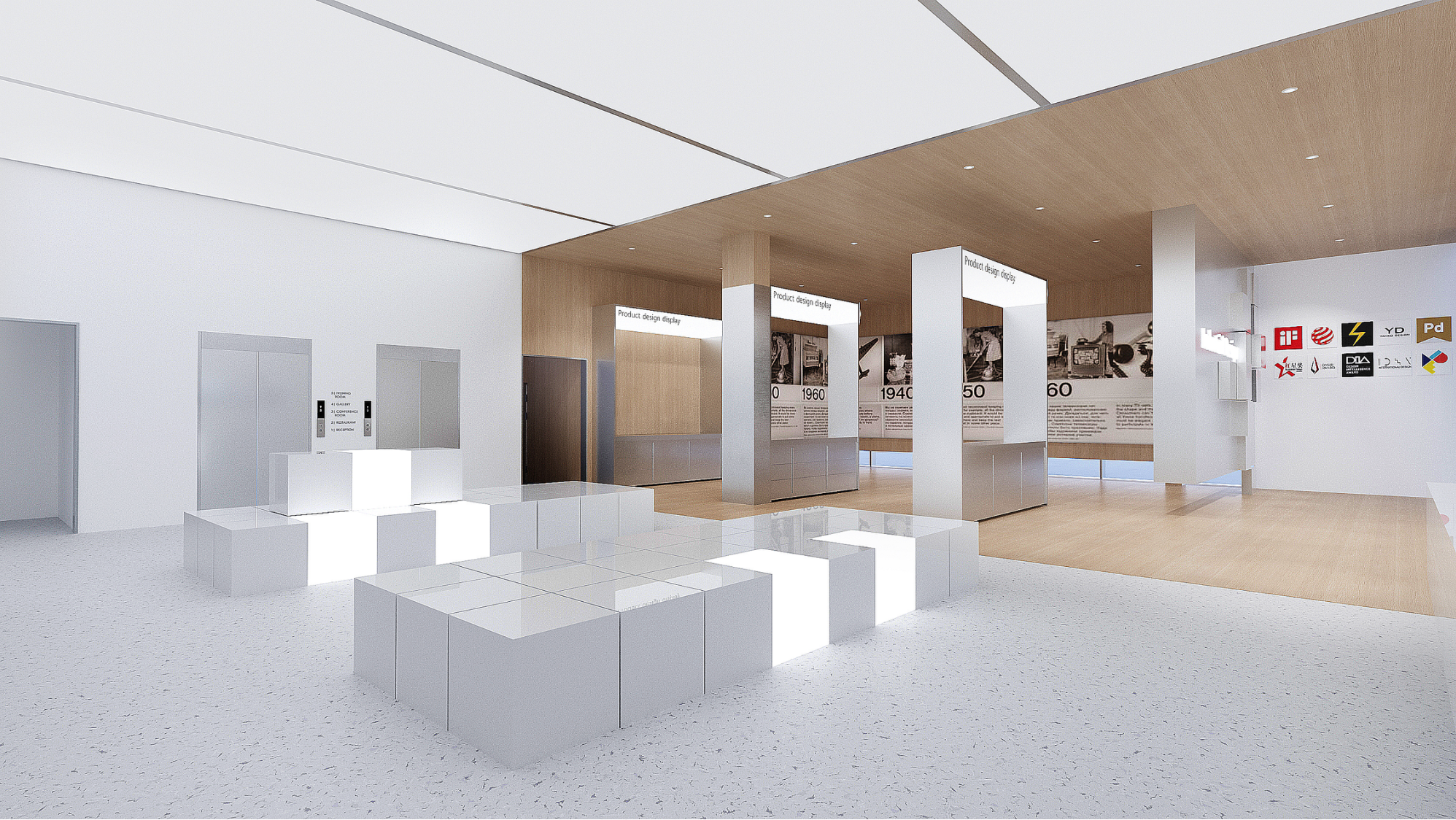 本项目为台州工业设计协会打造以“时间线”为主轴的展厅空间,飞鱼设计团队围绕“过去—现在—未来”的叙事路径,构建出五大功能区域:历史墙与“工业设计过去篇”以原木、书画等元素展现传统人文底蕴;“现在篇”则突出当下设计实践与成果;“未来篇”以蓝色主调与科技线条构建前瞻语境;多功能休息区融合传统材质与当代功能,连接文化与体验,整体呈现台州设计发展的连续性与创新力。