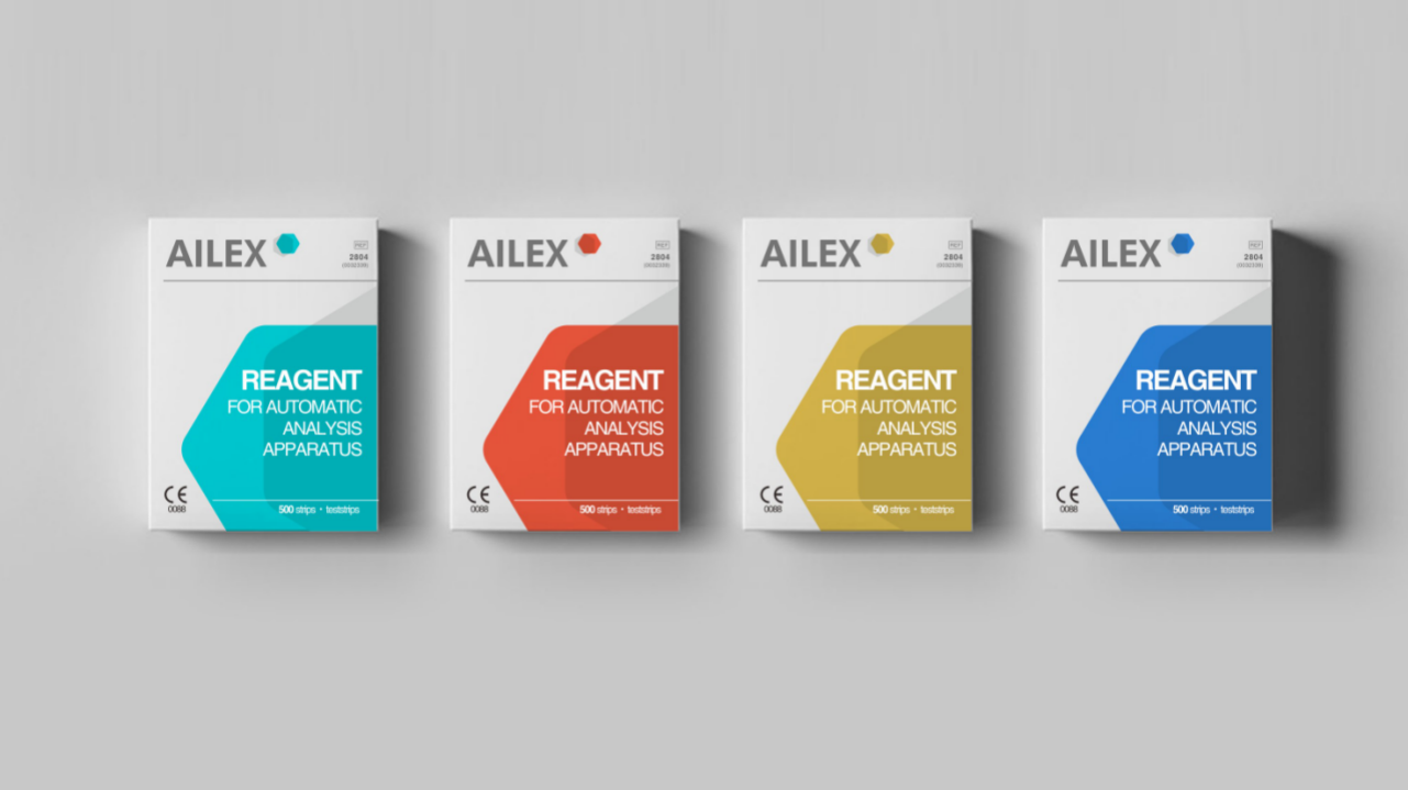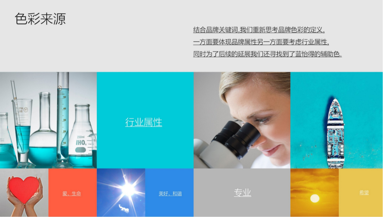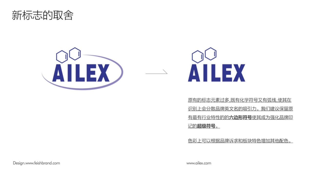 AILEX品牌设计,原有的标志元素过多,既有化学符号又有弧线,使其在识别上会分散品牌英文名的吸引力。建议保留原有最有行业特性的的六边形符号使其成为强化品牌印记的超级符号。结合品牌关键词,我们重新思考品牌色彩的定义一方面要体现品牌属性另一方面要考虑行业属性同时为了后续的延展我们还寻找到了蓝怡得的辅助色。