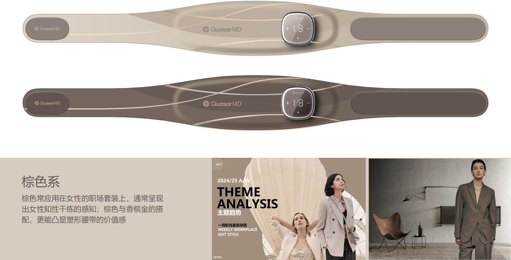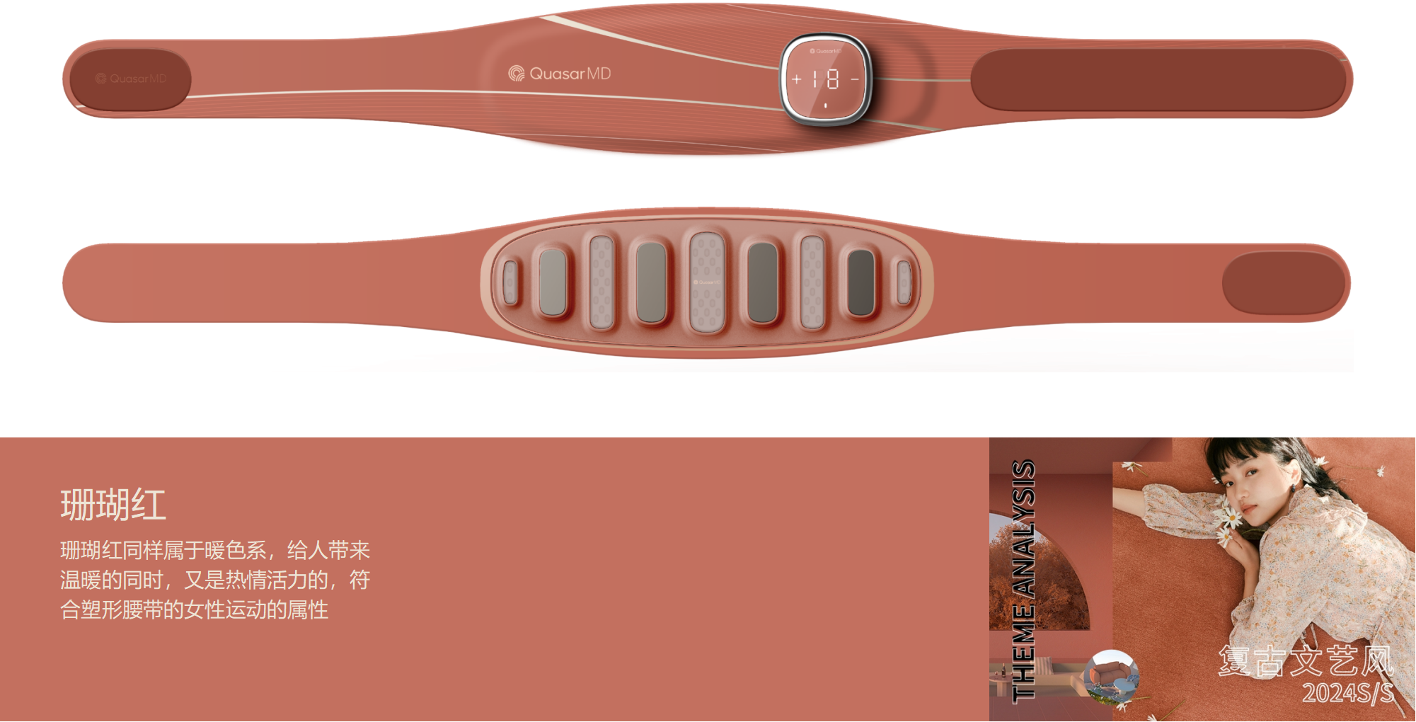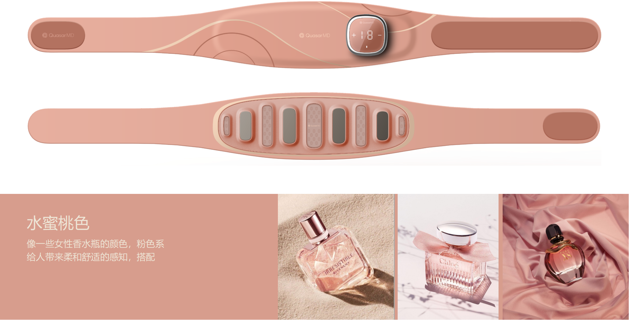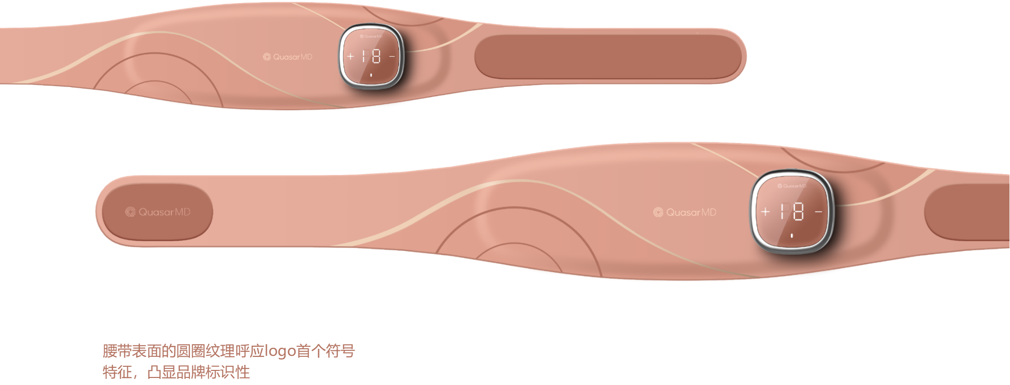 一款针对22-28岁一二线女性用户,躺平无需运动即可塑形的科施佳腰带产品。灵感源于丝带,逸动丝带轻柔呵护,律动曲线交叠形成独特外观轮廓,多种材质拼接丰富层次,同时将各功能模块融入其中。采用传统的穿戴方式,凸起魔术贴,使用更方便,同色系魔术贴,腰带更简洁,圆润的控制器造型,匹配腰带柔软亲和的视觉感知。产品LOGO彰显时尚元素设计,金丝纹理装点简洁面料,简约而又精致。