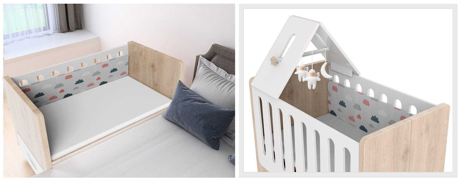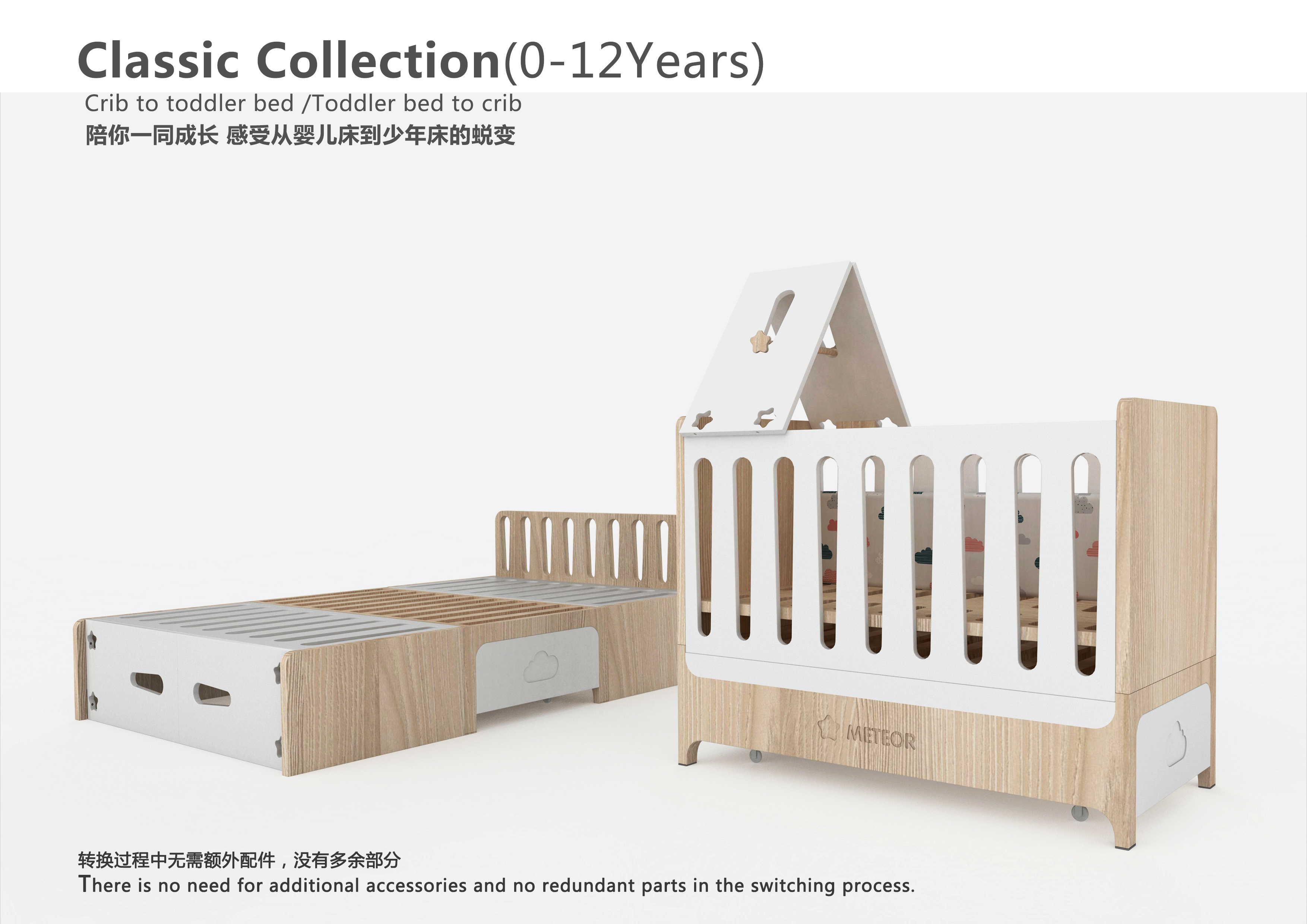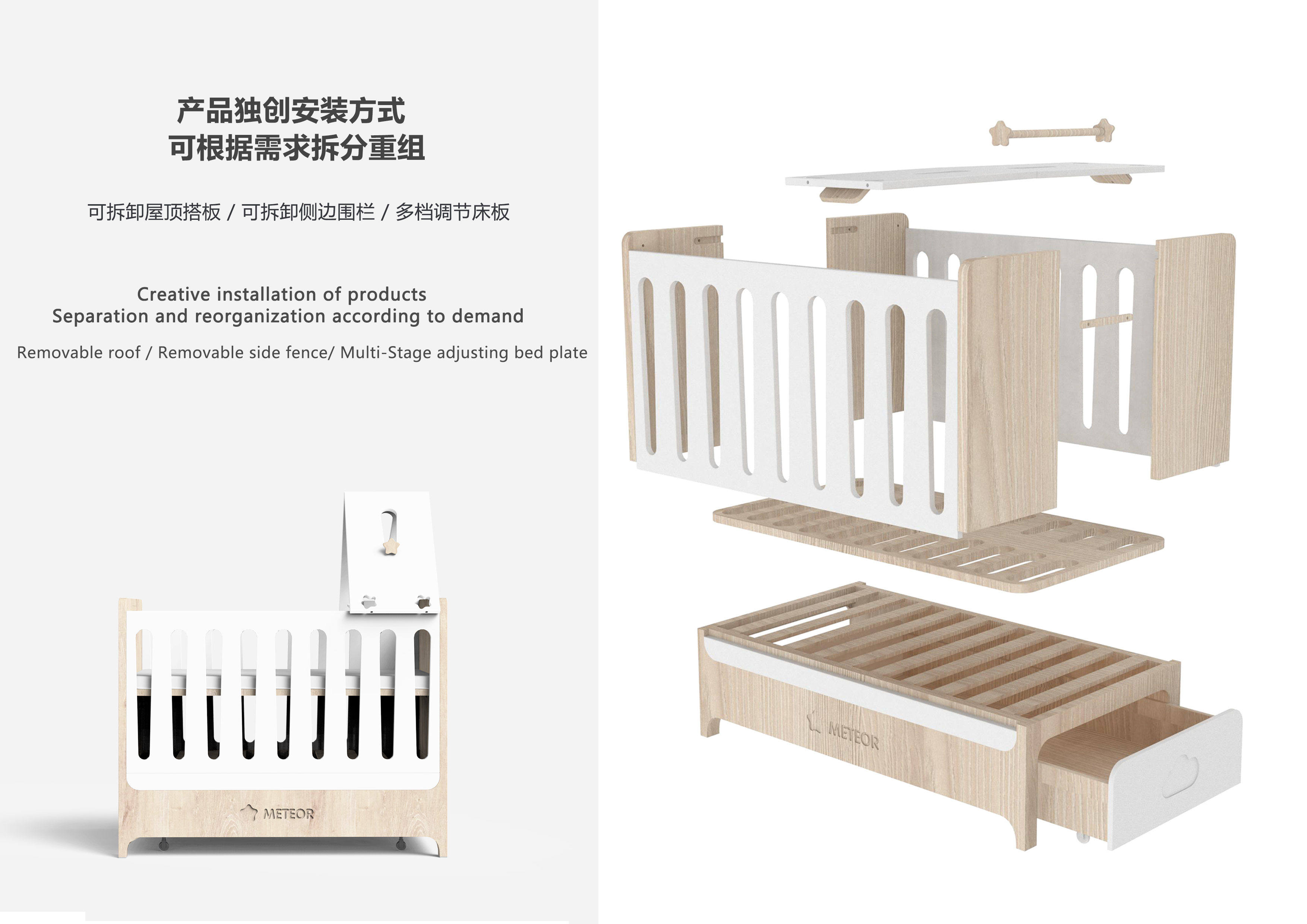 婴儿床是每个有宝宝家庭必备的用具,:市场现有的婴儿床都是固定式设计,这类婴儿床只适用于婴幼儿1~2周岁。随着幼儿逐渐长大,婴儿床的尺寸已经不适用,只能选择废弃。为此我们希望设计一款可以通过简单拆装,实现婴儿床与儿童床相互转化的多功能婴儿床,满足不同年龄段儿童的睡眠需求。