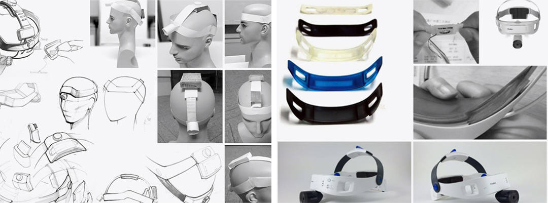 飞鱼设计还为Medzone设计了一款医用穿戴式头盔。配合Prodow高清手术视频传输系统,能够让医生在进行手术时,方便记录实时画面。主要头戴部分采用一体成型设计,给用户整体、轻巧同时也是可靠耐用的感受。在项目推进过程中我们通过快速迭代测试,对概念方案进行不断的测试和优化,逐步完善了产品的细节设计。